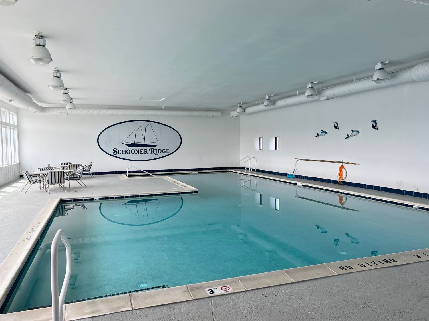 Clubhouse Hours Memorial Day to Labor Day: M-F 8:30am-7:30pm, Sat-Sun 10:00am-4:00pm; Off-season M-F 9:00am-6:00pm, Sat-Sun 10:00am-4:00pm (hours subject to change). Indoor pool, ping pong, and coin-operated games are open 9 am to 6 pm Monday through Friday and 10 am to 4 pm on Saturday and Sunday. The indoor heated pool. clubhouse, fitness rooms, tennis courts & playground are open year-round. The clubhouse outdoor pool is located at 119 Schooner Ridge Drive and open from 8 AM to 8 PM June through mid-September, weather permitting. There are two outdoor tennis courts located behind the clubhouse. Racquets are available for rent. Courts painted for pickleball. Wristbands must be worn at all times when using the amenities including accessing the beach via the community walkway.