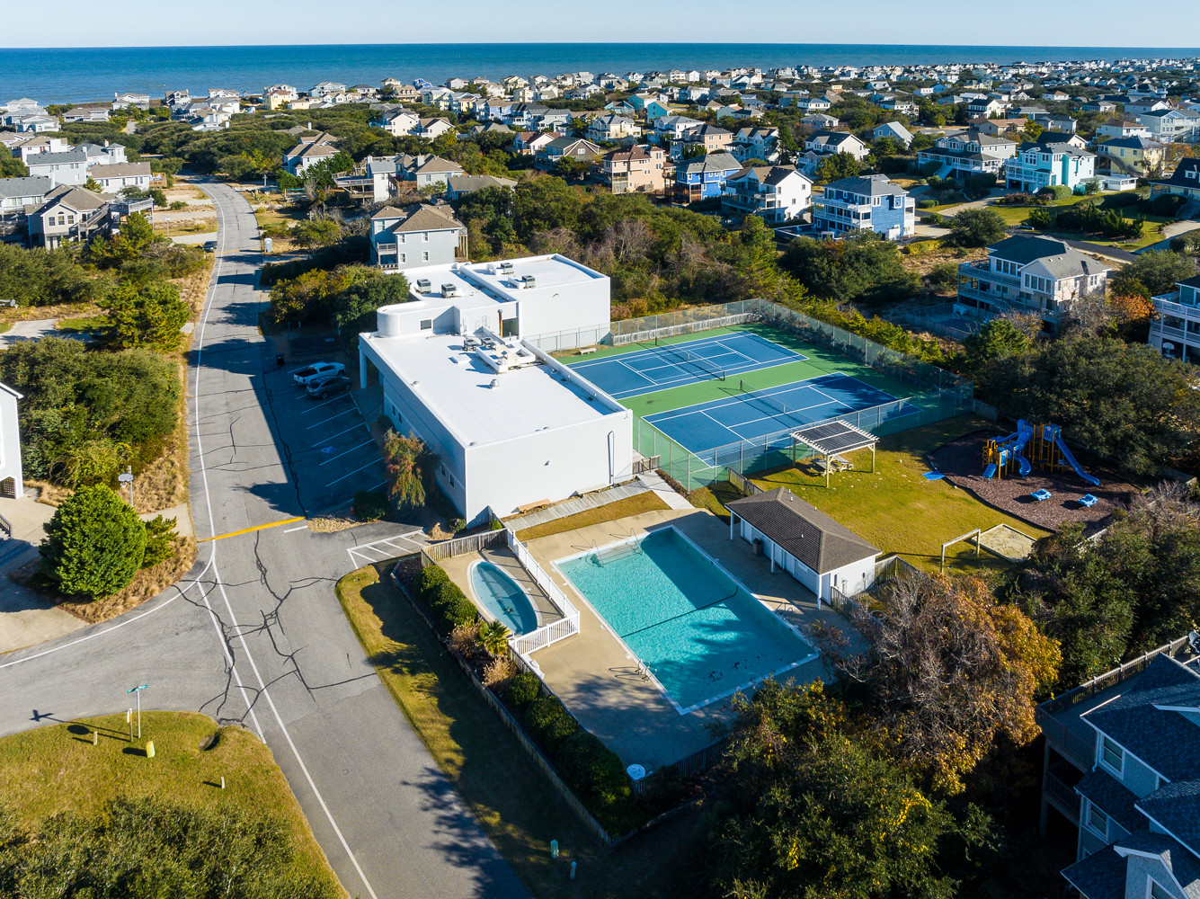 Schooner Ridge offers high elevations and sweeping views from homes perched atop the sand dunes. Vacation homes tend to reflect a more traditional Outer Banks style and vary in size from four to six bedrooms. An oceanfront outdoor pool, beach access with parking, tennis courts, clubhouse with racquetball courts, indoor pool, outdoor pool, video game room and workout room are all available to Schooner Ridge guests.